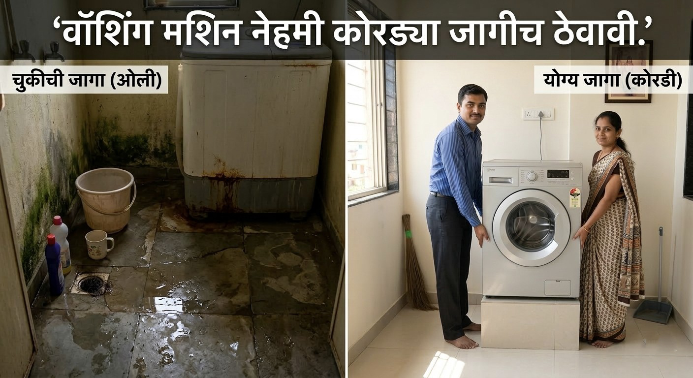 तुमच्या घरामध्ये बाल्कनी, गॅलरी किंवा किचनमधील एखादा कोपरा जिथे पाण्याचा थेट संपर्क येणार नाही, अशा ठिकाणी वॉशिंग मशिन ठेवा. जर तुम्हाला ती बाथरूमच्या जवळ ठेवायचीच असेल, तर ती जमिनीपासून थोड्या उंचीवर ठेवा (पडणार नाही याची खात्री करा) आणि आजूबाजूचा परिसर नेहमी कोरडा राहील याची काळजी घ्या.